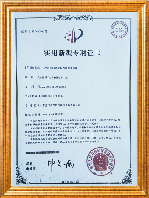 冷庫推拉門--專利證書
